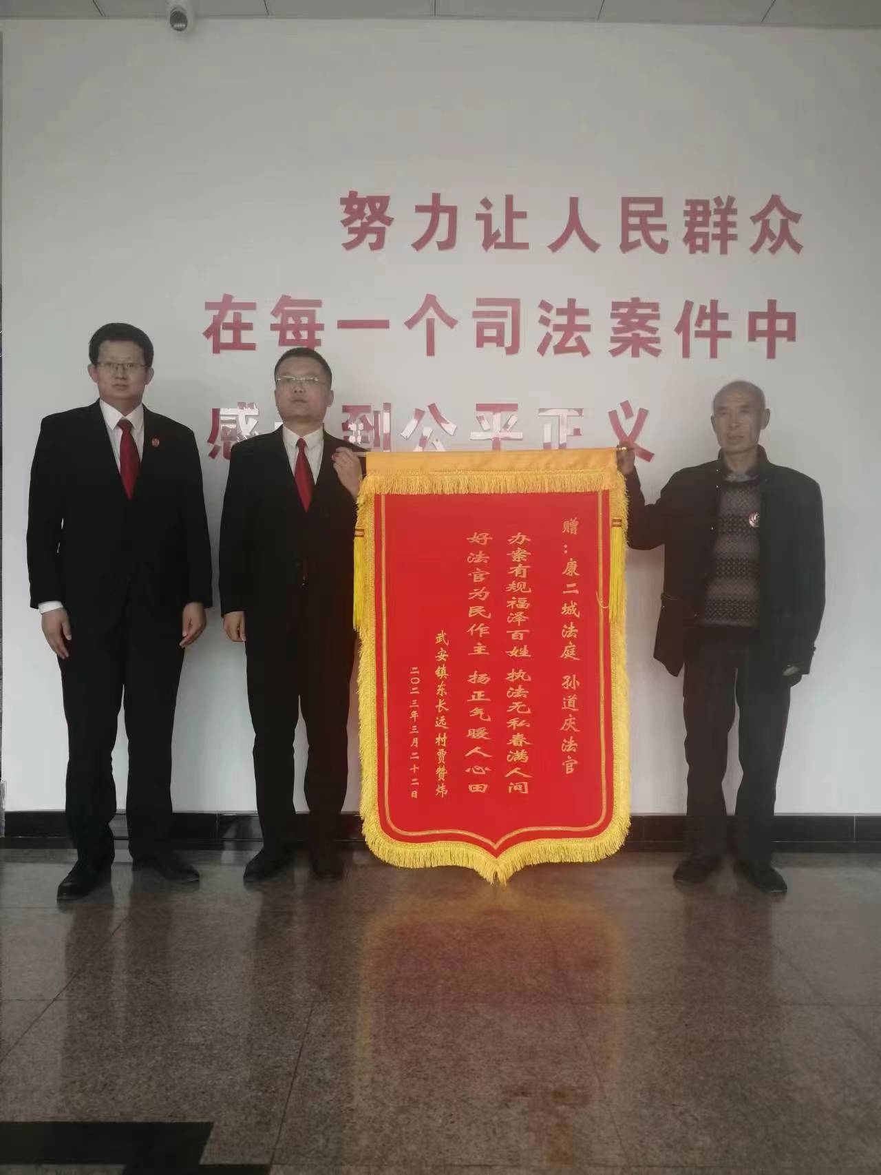 孙道庆法官为民申张正义,解民忧困,夜间派员下乡入户执法,使贾栓柱多年困忧的事情终于得到解决,使贾栓柱非常感动,赶制旌旗到法庭致谢。