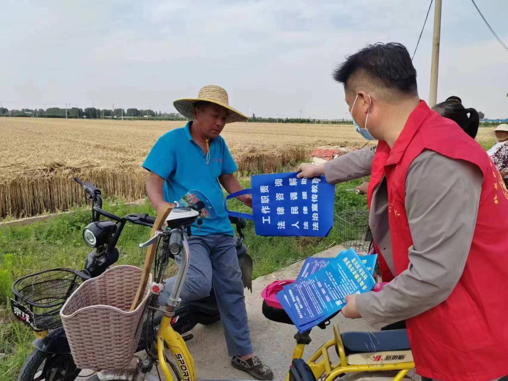 同志们不顾休息,还抽出时间在田间地头扎实开展“涉麦涉农”矛盾纠纷专项行动,根据麦收期间容易产生农村劳务纠纷、农资买卖纠纷、农机运营纠纷、地界争议纠纷、婚姻家庭纠纷、街坊邻里纠纷等实际情况,采取“预防为主、教育疏导、依法调处、防止激化等措施,宣传涉农法律法规,发放法治宣传资料,现场法律咨询,解答村民提出法律问题,遇到纠纷当场调处化解,并加大力度组织专人进行安全防范巡检,矛盾纠纷排查,有效排除各类安全隐患,预防和减少矛盾纠纷发生,用法治力量护航三夏,确保麦收顺利进行,和农民一起感受丰收喜悦。