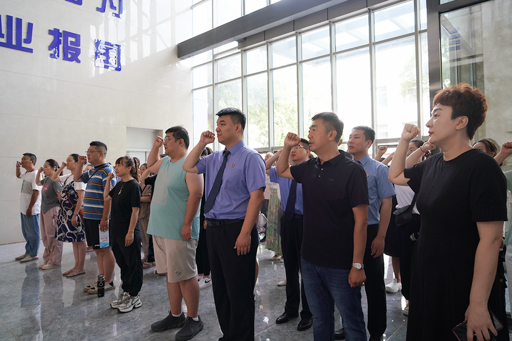 南岗区人民法院审判管理办公室(研究室)主任公丕潜庄严领誓,全体师生及工作人员肃立,举起右拳,共同发出掷地有声的反邪教誓言:“崇尚科学,反对邪教;明辨是非,坚守正道;青春无邪,向阳而生。”誓言铿锵回荡,将法治精神与反邪教决心融为一体,在青年学子心中深深植入了崇尚科学、敬畏法律、抵制邪教的坚定信念。