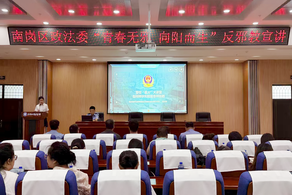 南岗区公安分局政治安全保卫大队刘冰旭以“如何辨识和抵制各种邪教”为主题开展反邪教宣讲。
