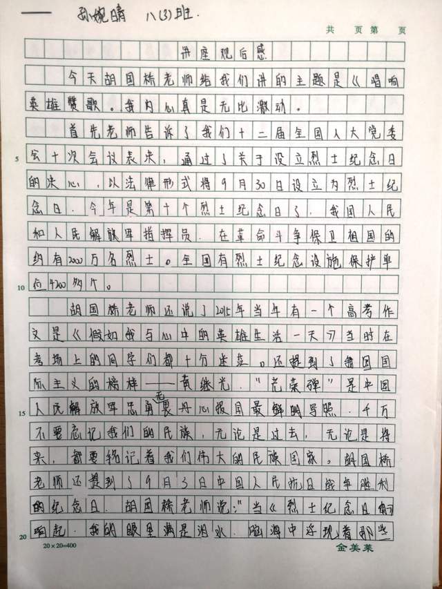 学生连一诺写道,今天我们年级用了倒数第二节课开会,主题是“唱响英雄赞歌”,这让我非常的难忘。主讲老师胡国桥是一位上过战场英雄奋战的战士,给我们讲了中国一共约有2000多万名烈士,这些烈士当中只有193万烈士有名字。因为他们的勇敢牺牲,才有了今天的新中国,向他们致敬!