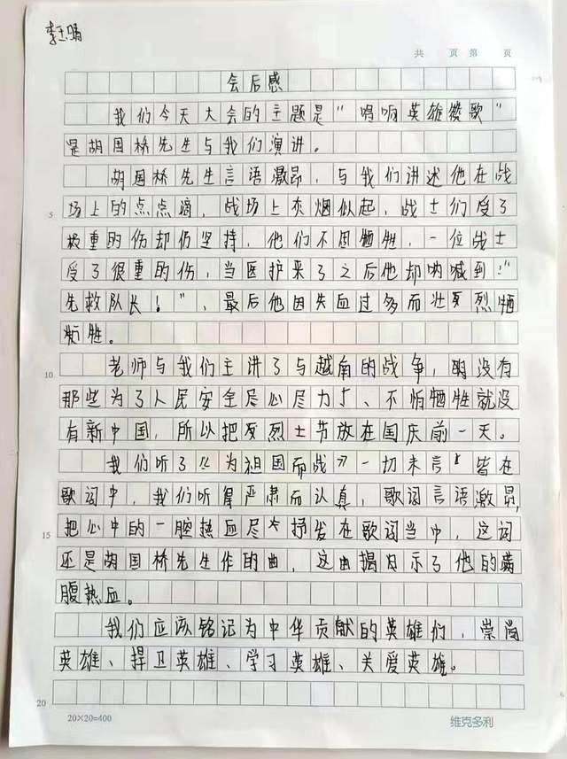 学生胡杨萱怡写道,今天下午,学校邀请了胡国桥同志来我校演讲,与其说是演讲,不如说是胡同志来给我们讲故事。他身上挂满了勋章,那些勋章一闪一闪的,像星星一样。原来他参加过战争,他给我们讲述了很多关于他那个年代的战斗故事。从一开始安安稳稳上大学,再到后来去为国征战。我国有4200多个英雄纪念基地,可见中国有多少烈士牺牲。在麻栗坡烈士陵园安葬了960位烈士,正好与中国960万平方公里领土面积数字相吻合。你们用青春和岁月,创造了我们今天的美好生活。你们的事迹永生长存。