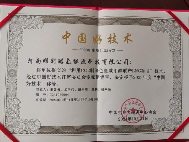 河南省顺成集团“利用CO2制绿色低碳甲醇联产LNG项目”荣获中国好技术A类奖项